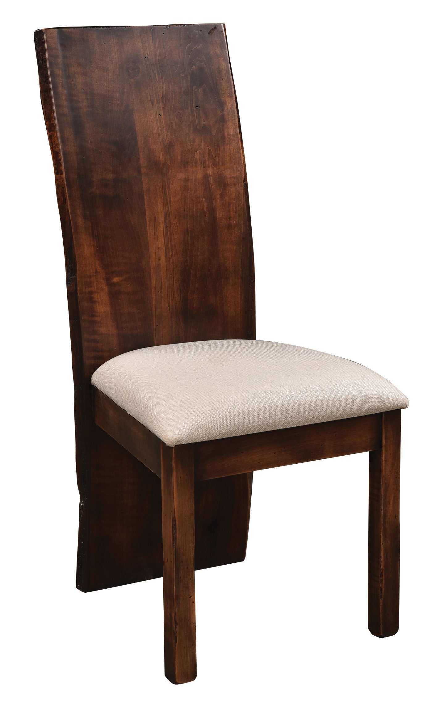 - 5 Quick Ship Live Edge Back Side Chairs with Fabric Seat shown in Wormy Maple with OCS-110 Medium Stain