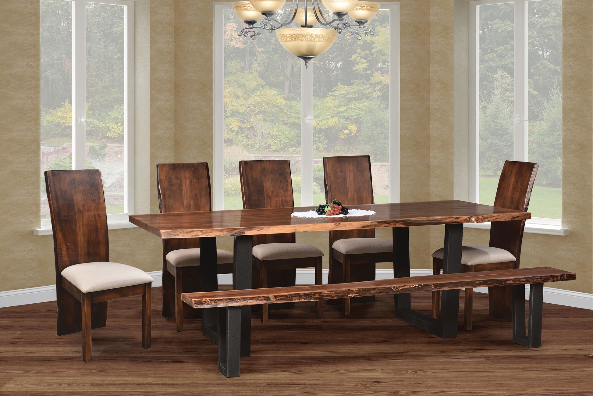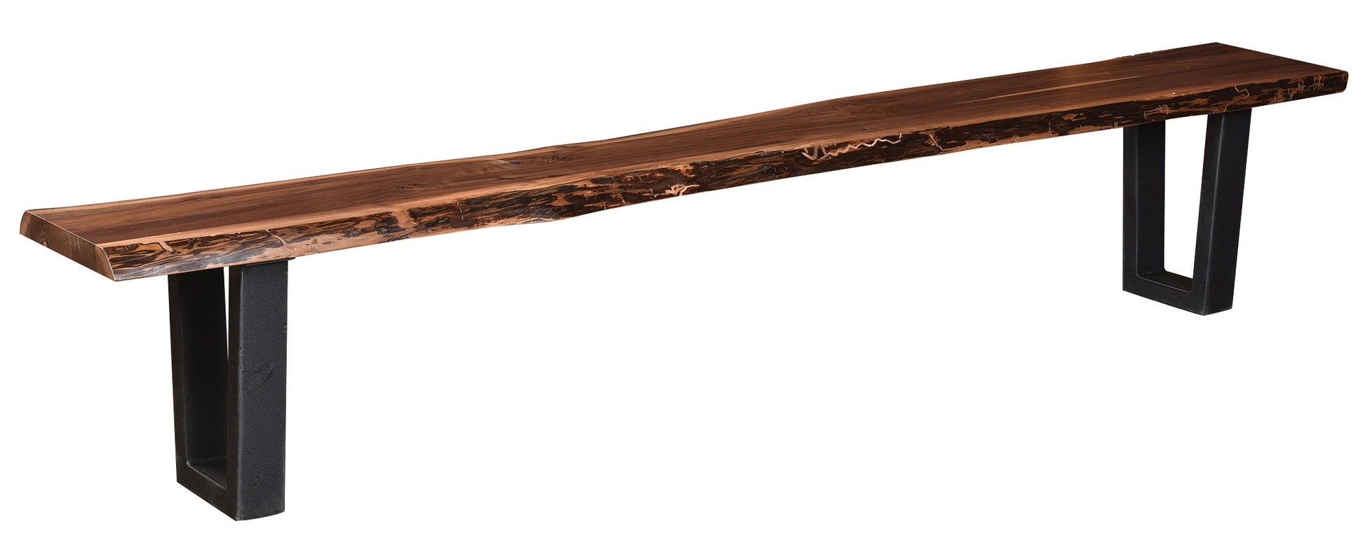 - Quick Ship Live Edge Table and Bench with #74 Metal Base shown in Rustic Walnut Wood with OCS-100 Natural Stain