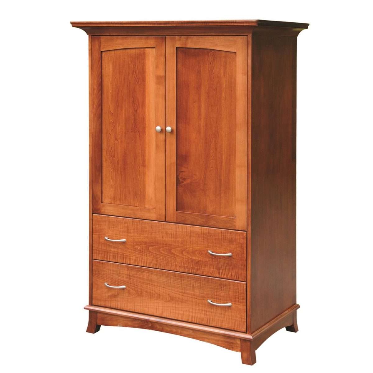 The Crescent sleigh bed promises sweet dreams and offers a comfy haven for settling in with a movie—thanks to the convenience of our handcrafted TV stands. The dresser shown includes an optional lined jewelry box, and all Crescent pieces feature unique turned-out legs. Shown in: Cherry Wood with OCS 108 Finish, HOK-22173 Pull, HOK-22129 Knob